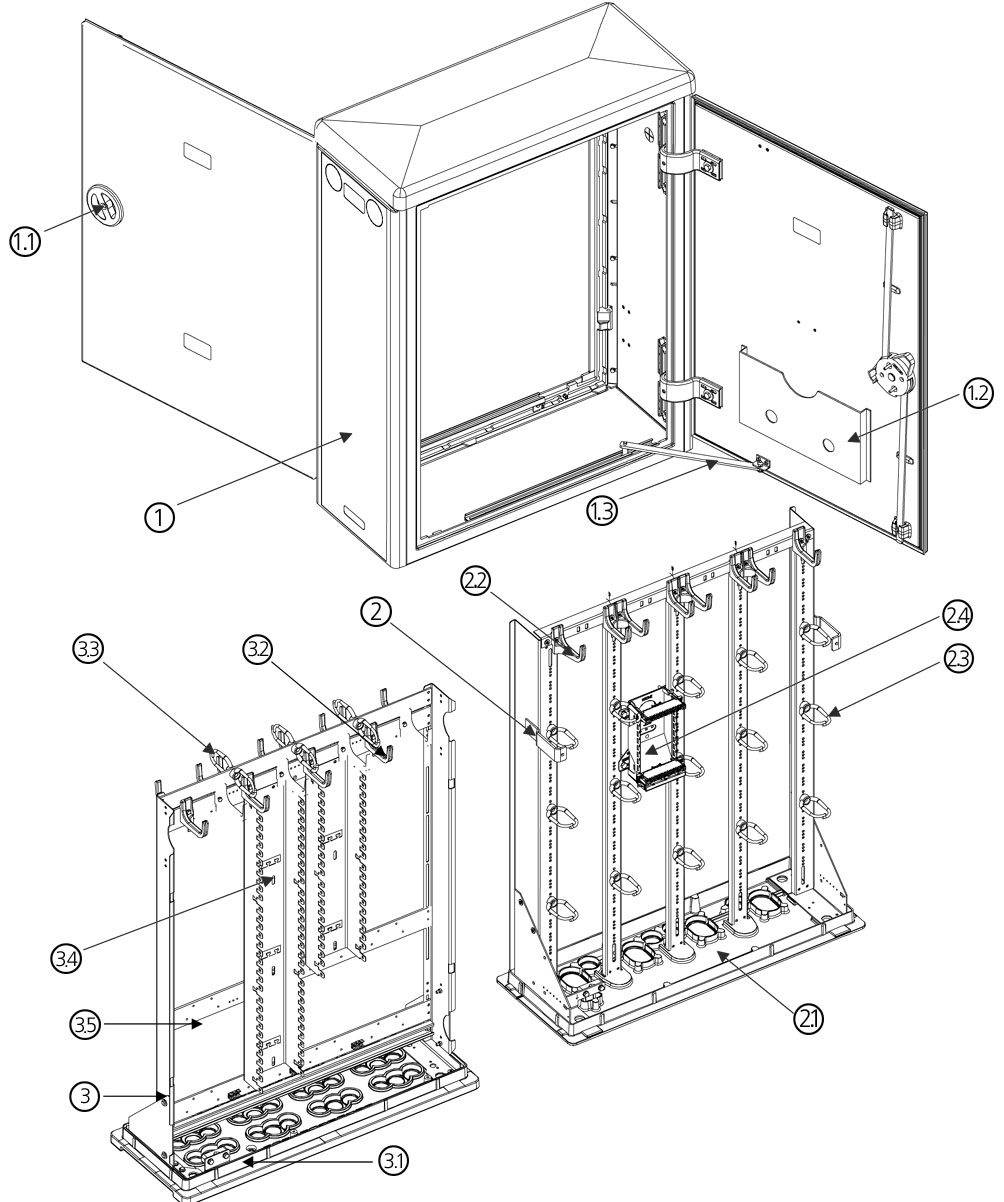 1 – Распределительный шкаф типа 59 с одной или двумя дверцами1.1 – Блокировочный замок KRONE типа 19, по 1 ключу на корпус1.2 – Отсек для документации (заказывается отдельно)1.3 – Фиксатор открывания дверцы (заказывается отдельно)2 – Монтажный каркас для оконечных устройств EVs для корпуса с одной дверцей2.1 – Плата основания